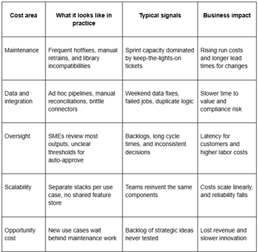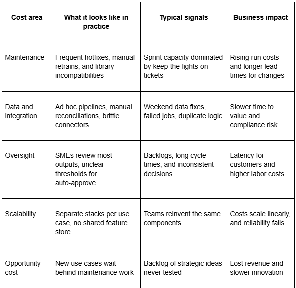 Model drift, feature rework, library upgrades, and infrastructure patching add recurring effort.